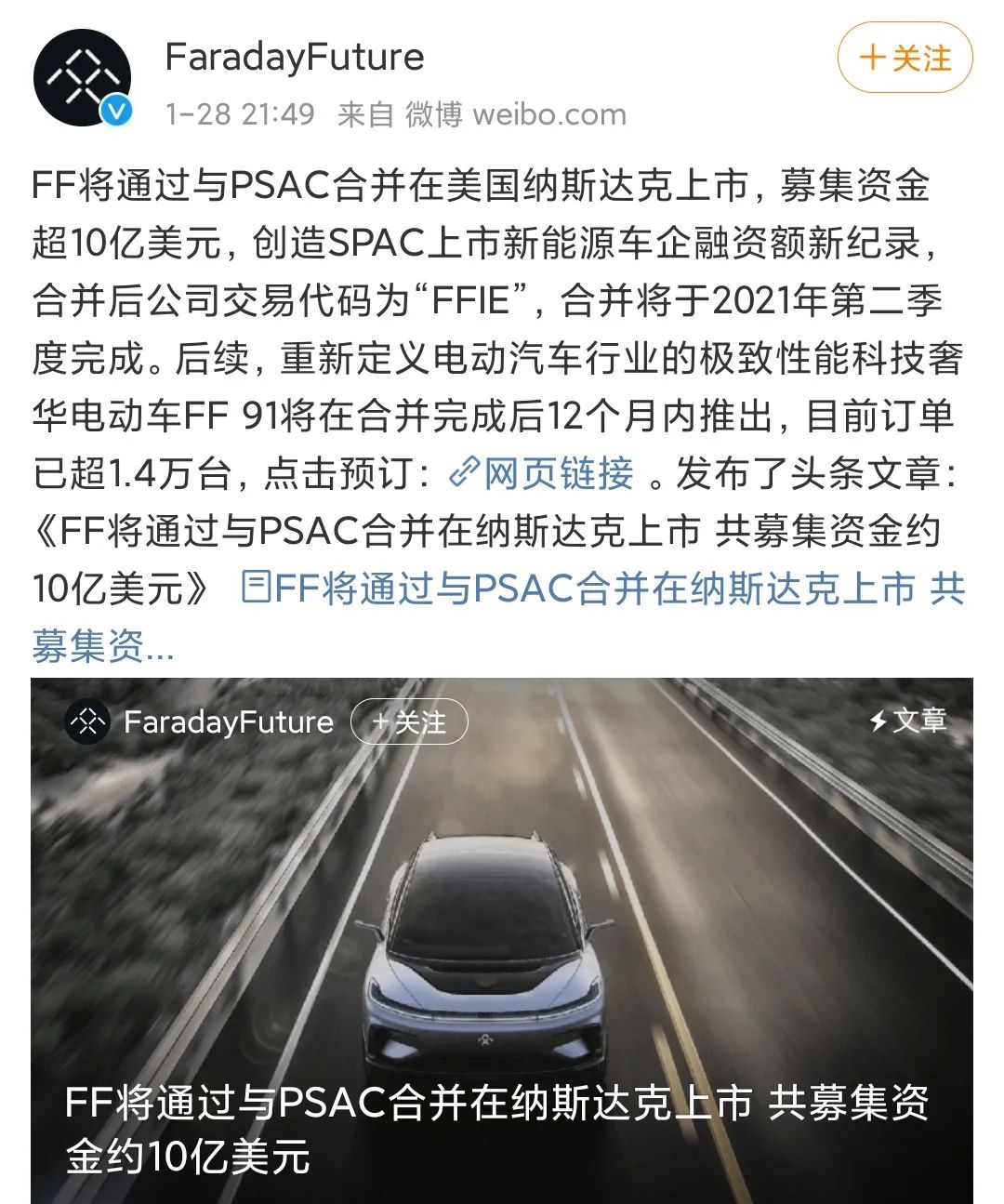 紧接着,据36氪报道,FF正在国内寻求新一轮融资,与此同时,FF表示将在两周内启动上市。此前,据彭博社报道,FF已开始寻求通过SPAC (Special Purpose Acquisition Company )的方式在美股上市。
