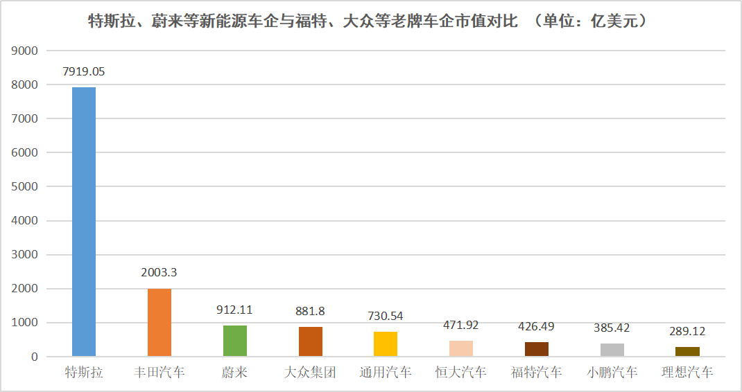 据老虎证券数据显示,截至昨日收盘后,特斯拉的市值为7919.05亿美元,蔚来、小鹏和理想紧随其后,分别为912.11亿美元、385.42亿美元和289.12亿美元。相比之下,丰田的市值为2003.30亿美元,几乎是特斯拉市值的1/3;而通用和大众分别为730.54亿美元和881.8亿美元,双双落后于蔚来与特斯拉。