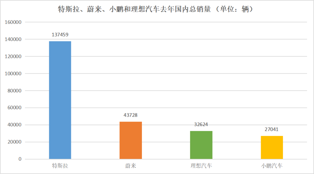 据乘联会数据,去年全年特斯拉国内总销量为137459辆、蔚来、理想和小鹏“三兄弟”紧随其后,分别为43728辆、32624辆和27041辆。
