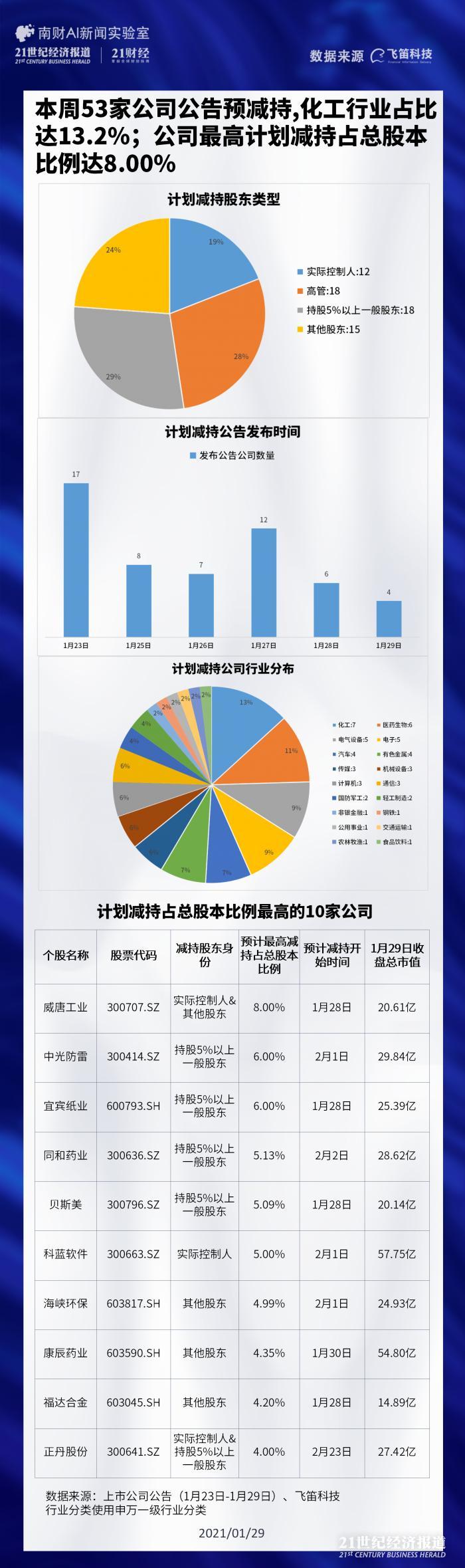 从减持时间分布来看,预减持公告发布最多的日期为1月23日,当日共有17家公司发布了计划减持公告。从减持公司的行业分布来看,计划减持公司数量排名前三的行业为化工(7家)、医药生物(6家)、电气设备(5家),三个行业合计共有18家公司发布了计划减持公告,占比达33.96%。