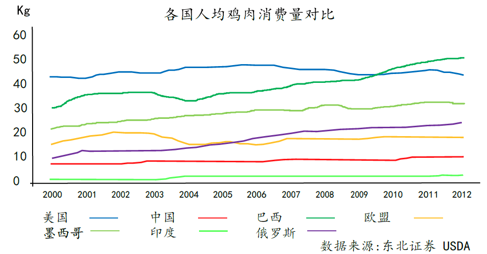 这意味着,中国的鸡肉消费需求正在向发达国家靠拢。如果从人均鸡肉消费量看,国内鸡肉消费还有显著的增长空间。