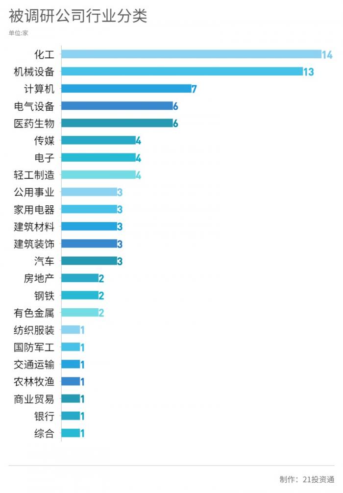 从行业分布来看,化工行业最受机构青睐,安利股份(300218.SZ)、青松股份(300132.SZ)、当升科技(300073.SZ)等14家相关公司被调研,其次是机械设备行业,有13家相关公司被调研。值得留意的是,机构对于电子行业的热情趋于减少,本周只有4家相关公司获调研。