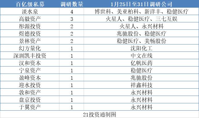 从具体调研机构来看,淡水泉、高毅资产、敦和资产、景林资产等14家百亿知名私募调研了13家公司。其中,淡水泉最为积极,调研了稳健医疗(300888.SZ)等4家公司。高毅资产、淡水泉、景林资产、煜德投资等5家百亿私募调研了稳健医疗,永兴材料(002756.SZ)获敦和资产、彤源投资、盘京投资、于翼资产共同调研。