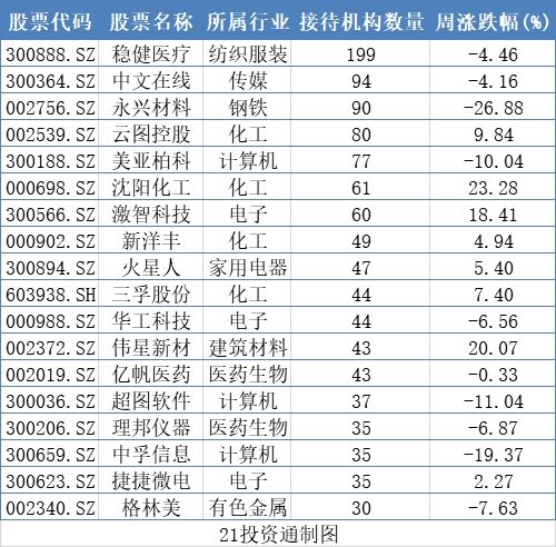 接待机构数量方面,稳健医疗(300888.SZ)成为最受机构青睐的个股,获199家机构扎堆调研,是过去一周唯一一家接待超百家机构的公司。
