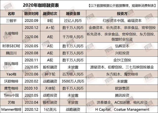 观潮新消费(ID:TideSight)根据网络公开信息不完全统计,国内互联网咖啡创业公司近年来公布的融资金额共计近30亿人民币,背后涉及VC/PE达30家。