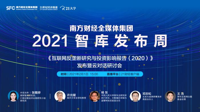 2月1日,由南方财经全媒体集团主办的智库发布周之“互联网反垄断研究与投资影响”研讨会在线上召开,发布南财21智库出品的《互联网反垄断研究与投资影响报告(2020)》。会上,南开大学法学院教授许光耀、中国人民大学竞争法研究所执行所长杨东、大成律师事务所高级合伙人邓志松、银华互联网主题基金经理王浩共同探讨互联网反垄断监管之策,解读投资影响与趋势。