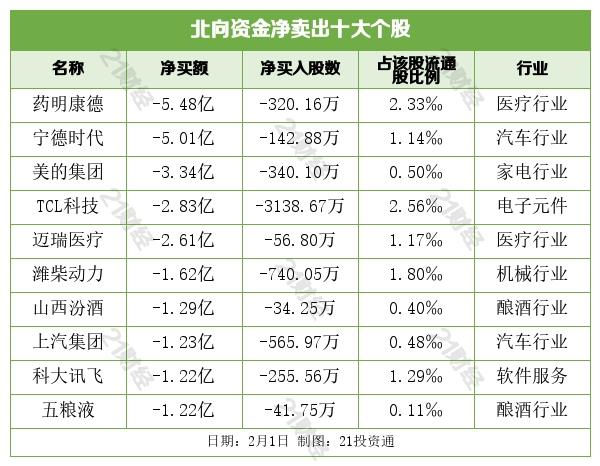 药明康德、宁德时代、美的集团被卖出金额居前,分别被净卖出5.46亿元、5.06亿元、3.30亿元。
