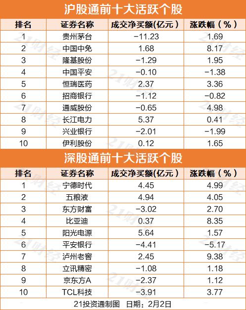 今日十大活跃个股方面,阳光电源、长江电力、五粮液、宁德时代净买入居前,分别获净买入5.64亿元、5.37亿元、4.94亿元、4.45亿元;贵州茅台、平安银行、TCL科技净卖出居前,金额分别为11.23亿元、4.41亿元、3.91亿元。