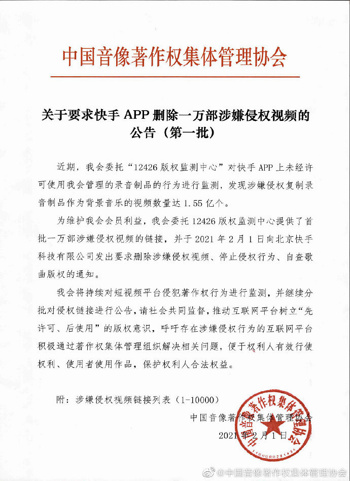 2021年2月1日午间,国家版权局授权成立的“中国音像著作权集体管理协会”(以下简称“音集协”)通过官方微博发布《关于要求快手APP删除一万部涉嫌侵权视频的公告(第一批)》。
