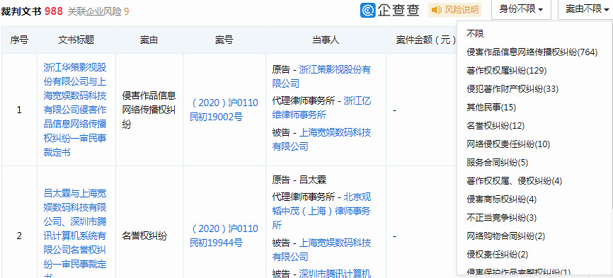 而B站责任主体“上海宽娱数码科技有限公司”在二次创作的社区氛围背后,是764件侵害作品信息网络传播权纠纷、129起著作权权属纠纷以及10起网络侵权责任纠纷,累计占比高达91.3%。