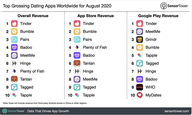 同时在竞争层面,Bumble与Tinder在用户竞争层面还是有不少的重合。据 Sensor Tower 数据,在全球约会交友软件总收入排名里,Tinder在三个榜单排名都是第一的位置,Bumble 和 Badoo 分列第二和第四。