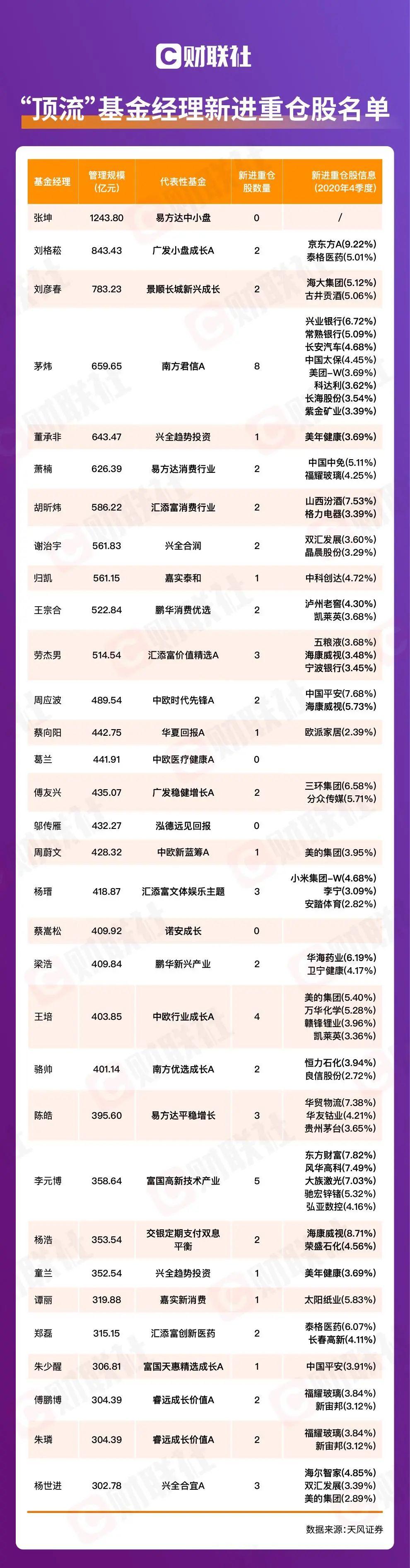 机构投资者在信息获取和投研能力等方面,具有明显优势,使其成为A股投资的风向标。据天风证券研报梳理,目前有165位基金经理,旗下主动权益类基金管理规模达到了百亿级别。其中前三名分别为易方达基金的张坤、广发基金的刘格菘、景顺长城基金的刘彦春。