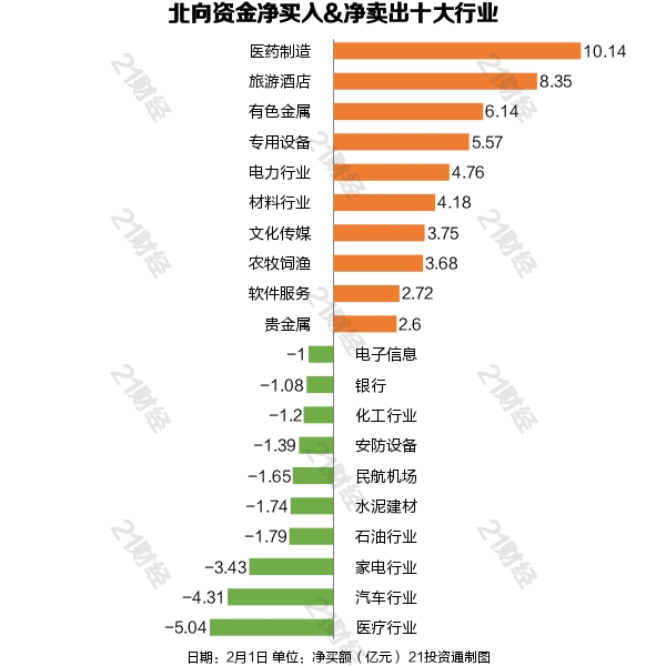 从净买入金额来看,北向资金增持了31个行业,其中医药制造居首,净买入金额达10.14亿元,其次是旅游酒店行业,净买入8.35亿元。