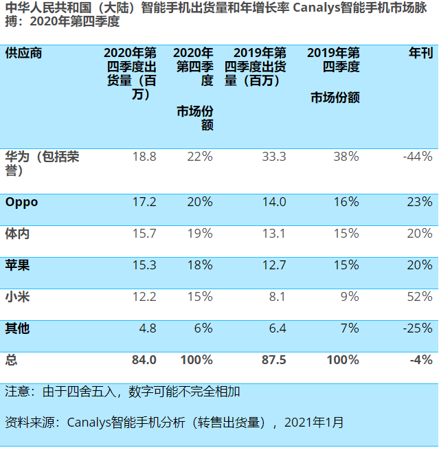 根据Canalys发布的2020年第四季度中国智能手机市场研究报告显示,华为(包括荣耀)出货1880万台,虽然仍保持第一的位置,但市场份额从2020年第三季度的41%下降至22%。