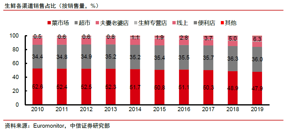 从图表中可以直观的看到,线上市场份额由2010年的0.5%提升至2019年的6.3%,随着物流、供应链及大数据等技术的应用,生鲜销售由菜市场、夫妻店等向线上、超市、社区生鲜等转移,且转移规模会越来越大,各大商超企业,在投资及并购中,已经着力在生鲜渠道上。