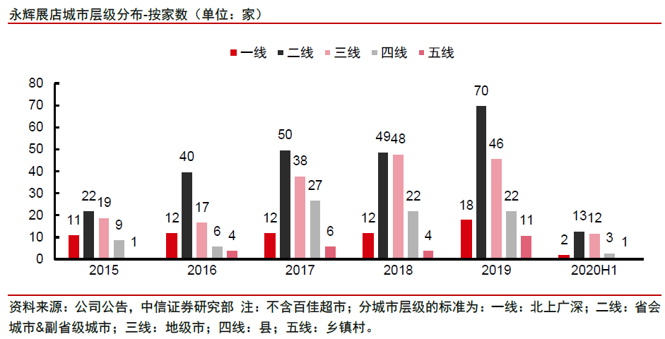 以永辉超市来看,进入2020年以后,其开店速度节奏加快。官网显示,截至2020年9月底,永辉已自主展店40余家,且主要集中在二、三线城市。从永辉开店情况来看,新开门店主要集中在二线以上的城市。
