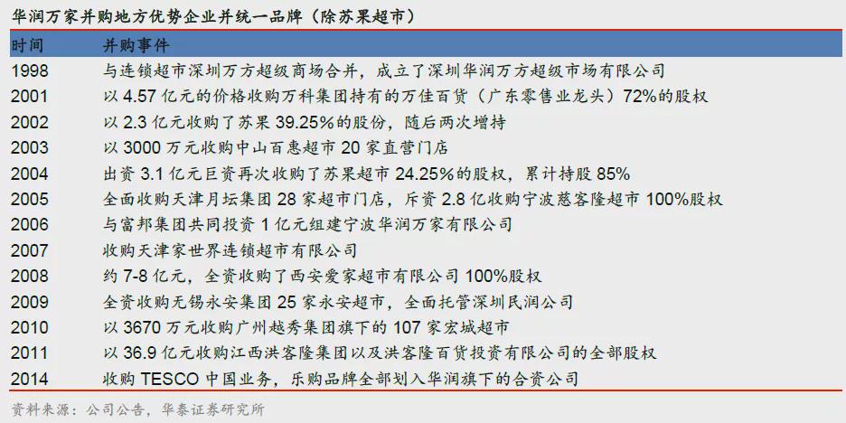 与华润的扩张相对应的,是一部华润的收购史。自1998年与深圳万方的合并、组建深圳华润万方超级市场有限公司起,在之后的10余年中,华润几乎每一年都会出现大规模的收购。