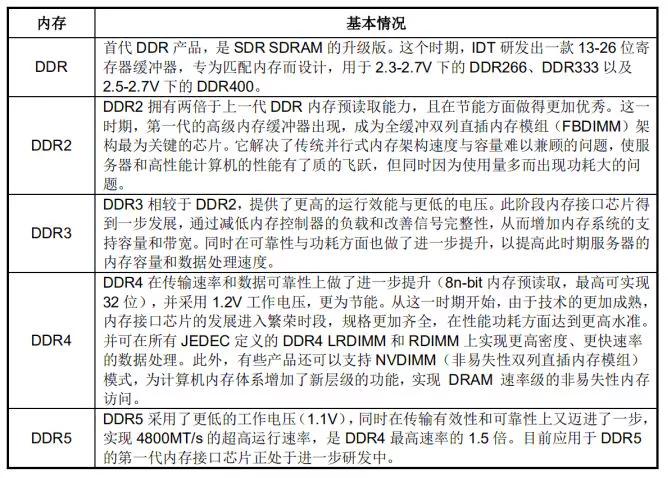 内存接口芯片是跟随服务器内存产业而发展的,随着内存由DDR2、DDR3演进到DDR4,数据传输速度由800MT/s、1600MT/s演进到3200MT/s,工作电压由1.8V、1.5V演进到目前业界最低电压1.2V,由于服务器内存子系统面临的主要瓶颈仍然是高速度、大容量、低功耗下的信号完整性问题,所以需要进行不断的产品升级。