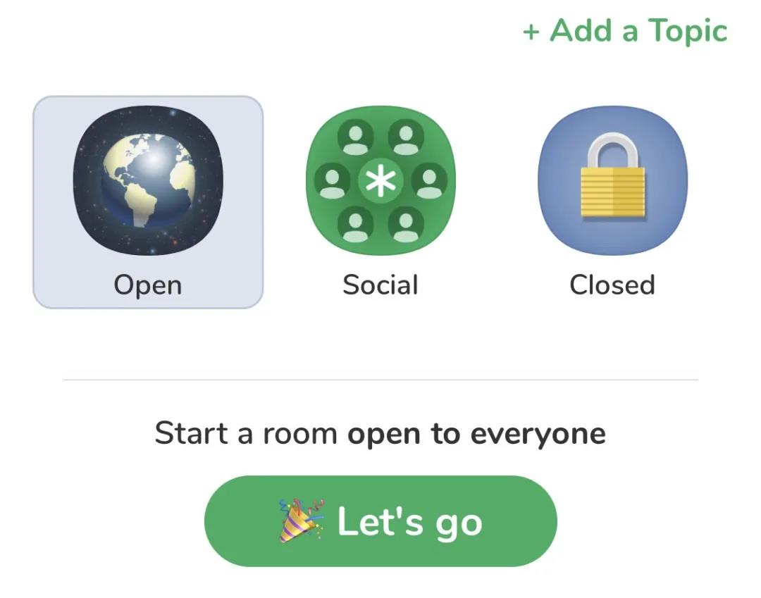 Clubhouse 的聊天室有「公开」、「社交」和「私密」三种属性,对应着公共议题讨论、社群交友和私聊三种需求。