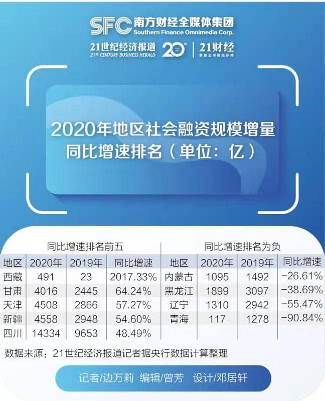 此外,2020年社会融资规模增量排名末尾的五个地区分别是内蒙古、海南、宁夏、西藏、青海,具体数据分别是1095亿、970亿、872亿、491亿、117亿。与2019年相比,宁夏由倒数第四位滑至倒数第一。若就社会融资规模增量同比增速来看,西藏以2017.33%的成绩稳居第一,其后依次是甘肃、 天津、新疆、四川,同比增速64.24%、57.27%、54.60%、48.49%。