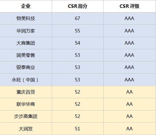根据CSR总分排名将28家商业零售样本企业划分成四个等级,其中前4名为AAA级,依次是:物美科技、华润万家、大商集团、国美零售、银泰商业、永旺(中国);7-10名为AA级,依次是:重庆百货、联华华商、步步高集团、大润发。