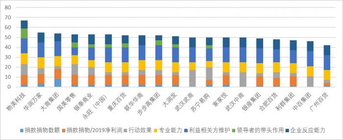 导语:商业零售行业在本次疫情中的得分主要体现在相对捐赠能力、利益相关方维护和企业反应能力这三个方面,尤其在利益相关方维护和企业反应能力这两项上,28家企业的得分均值较高且接近满分。