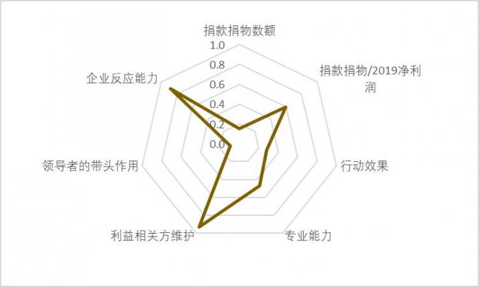 从雷达图看,行业整体在绝对捐赠能力、行动效果和和领导者的带头作用方面的表现略有欠缺。28家代表性企业在这三项一级指标上的平均得分分别低于该项满分的20%、30%和10%。行业内部表现在各方面都有差异,行动效果内部波动最大,企业反应能力内部波动最小。