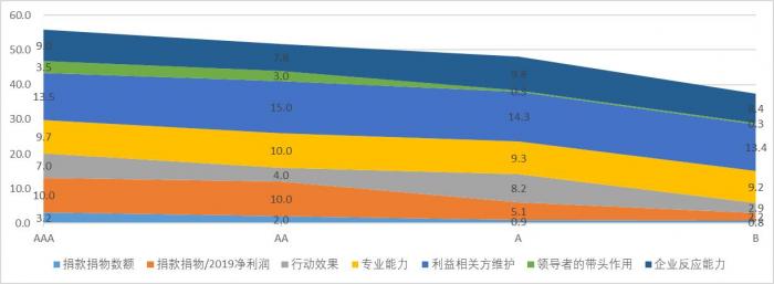 从分级统计图来看,不同CSR级别企业之间的得分差距在每个方面都有所体现,主要体现在相对捐赠能力、行动效果和领导者带头作用这三个方面。CSR总分前十的AAA级与AA级企业在相对捐赠能力和领导者的带头作用这两项的平均得分与后面两个评级的企业出现了明显的断层。不同评级企业在行动效果方面的得分没有规律,B级企业的平均水平明显不如前三层级。