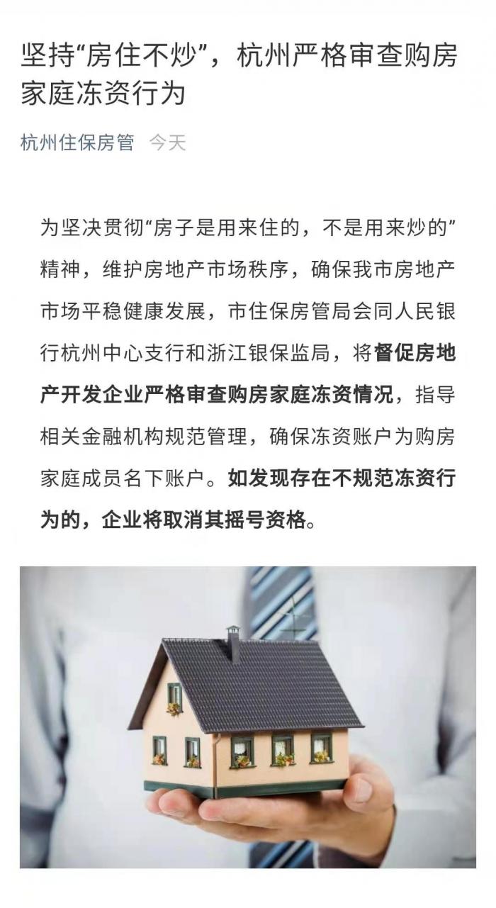 “杭州住保房管”微信公众号消息,为坚决贯彻“房子是用来住的,不是用来炒的”精神,维护房地产市场秩序,确保杭州市房地产市场平稳健康发展,杭州市住保房管局会同人民银行杭州中心支行和浙江银保监局,将督促房地产开发企业严格审查购房家庭冻资情况,指导相关金融机构规范管理,确保冻资账户为购房家庭成员名下账户。如发现存在不规范冻资行为的,企业将取消其摇号资格。
