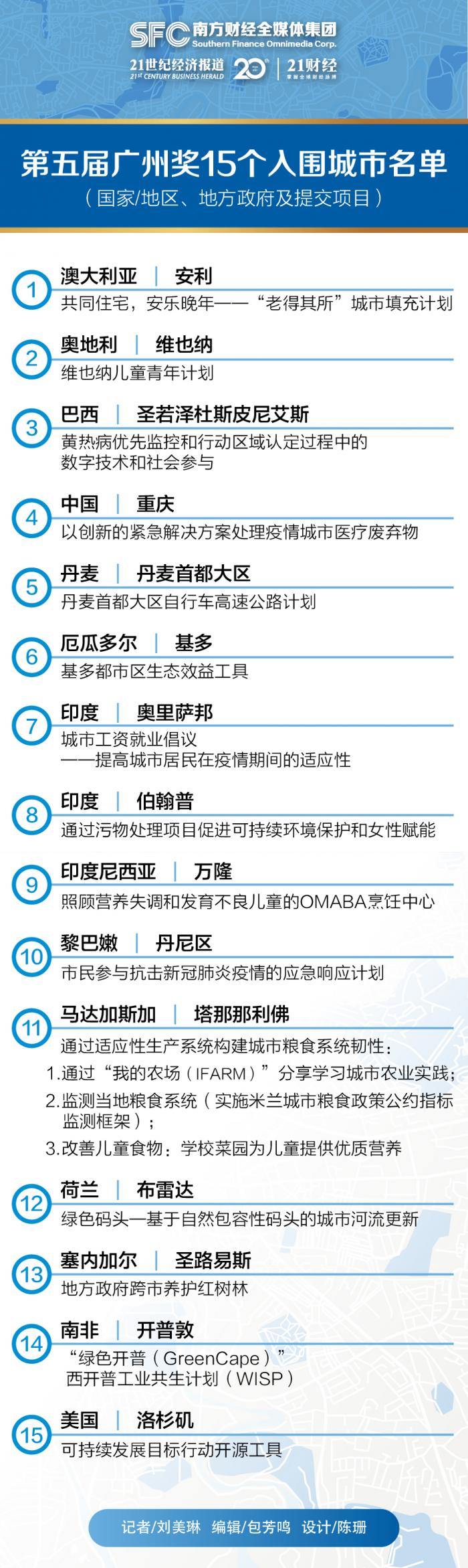 广州奖日益成为全球地方和城市层面推进落实联合国可持续发展目标(SDGs)和《新城市议程》的重要平台。21世纪经济报道记者从广州奖办公室了解到,第五届广州奖共收到来自60个国家和地区175个城市的273个项目申报,包括澳大利亚安利、奥地利维也纳、巴西圣若泽杜斯皮尼艾斯、中国重庆在内的15城脱颖而出,成为初评的15座入围城市。