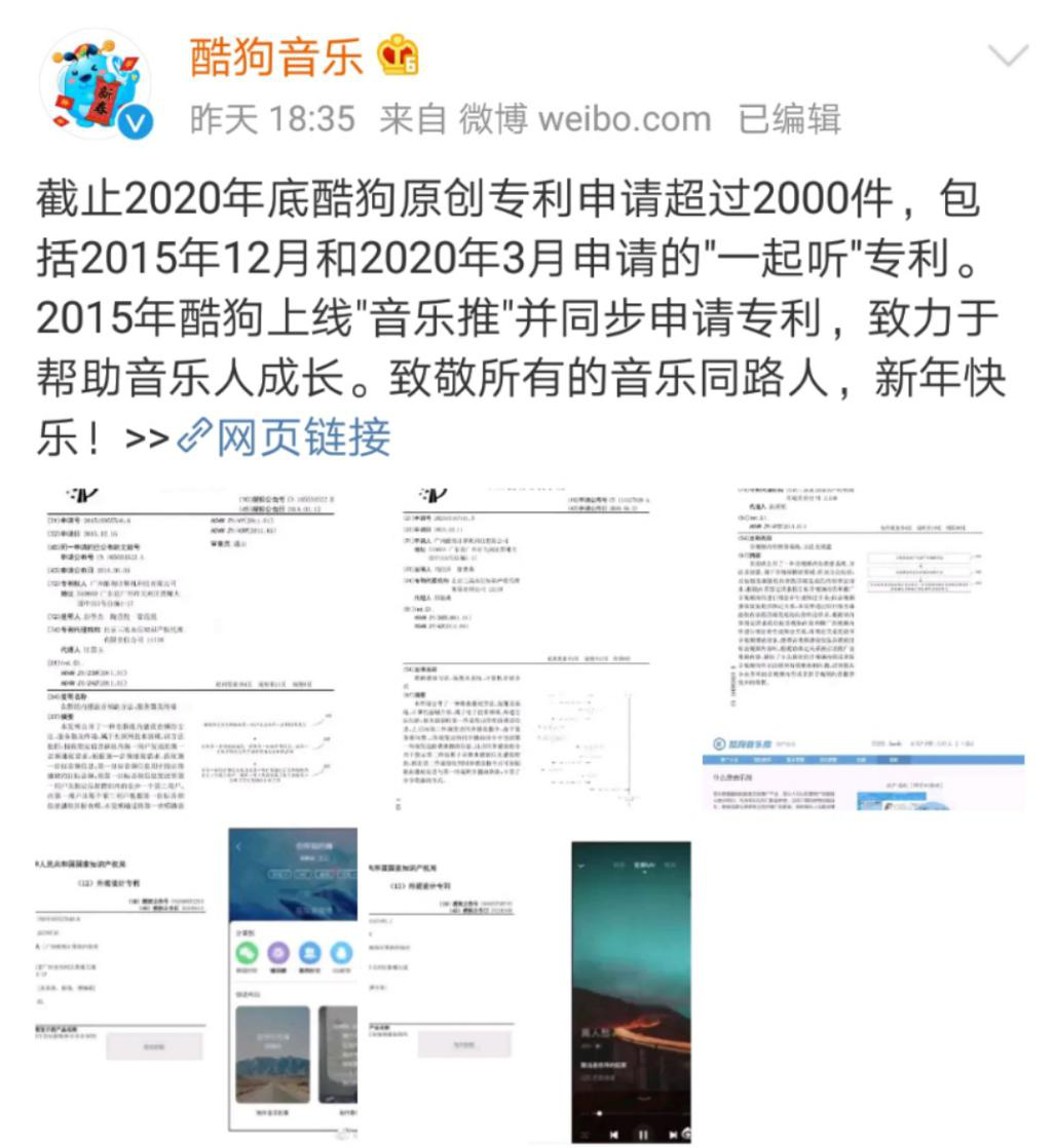 当天晚上六点半,吃瓜群众终于等来了酷狗音乐的正式回应,酷狗方表示平台上线的“一起听”以及“音乐推”皆已经同步申请专利,并附带上专利图片与周杰伦的《黑色幽默》音乐链接。