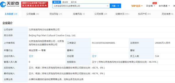 据天眼查APP显示,北京泡泡玛特文化创意有限公司成立于2010年10月,注册资本2亿人民币,法定代表人为王宁。