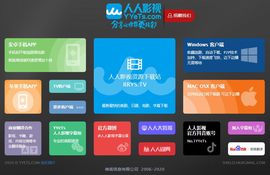目前,在网页上搜索“人人影视”后仍能顺利的进入其官方页面,然而点击“人人影视资源下载站”和“Windows客户端”等其他页面却无法顺利打开。此外,点击页面上方的“捐赠我们”链接,点开后会出现“感谢大家的支持!我们正在调整”的字样。