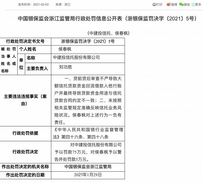 2月3日,浙江银保监局公告显示,中建投信托因贷前贷后审查不严导致大额信托贷款资金回流借款人他行账户并最终导致贷款资金用途与信托贷款合同约定不一致;未按照相关监管规定准确反映信托业务风险状况等案由被浙江局罚款75万元。作出处罚决定的日期为2021年1月29日。而侯春枫对前述行为负有部分责任,对其予以警告并处罚款5万元。