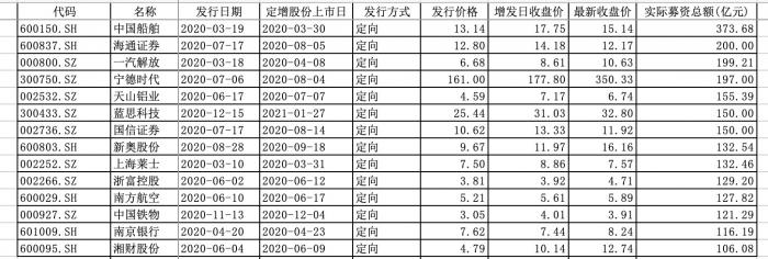 在定增市场升温的大环境下,单个标的百亿级定增也是屡见不鲜。Wind统计显示,定增新规以来,实际募集资金规模在100亿上的案例有14起,其中中国船舶、海通证券、一汽解放等实际募集资金规模分别是374亿元、200亿元和199亿元。