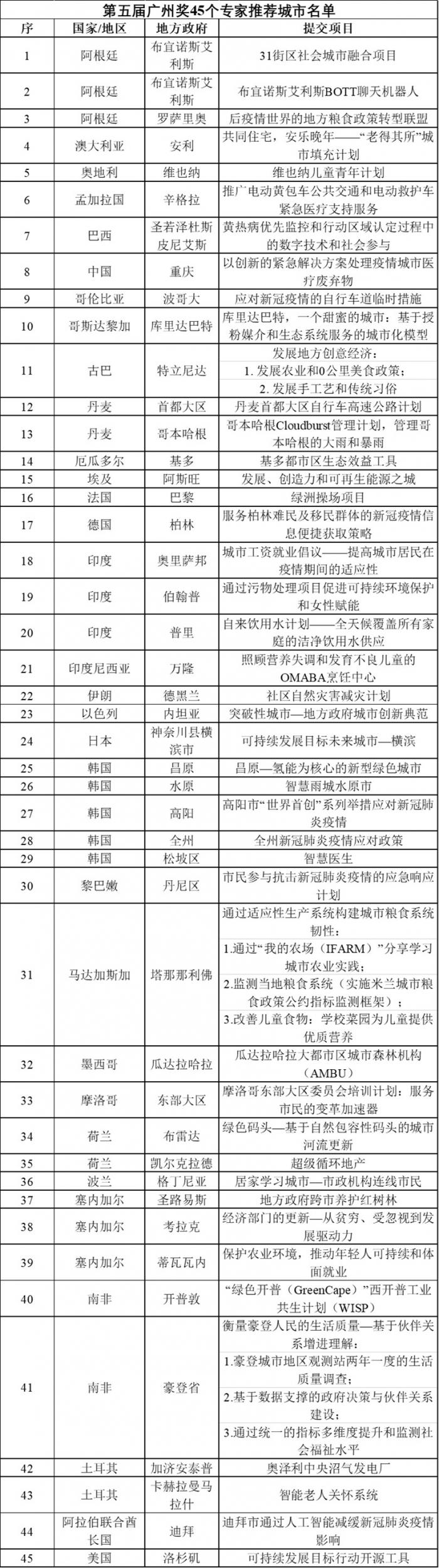 广州奖自2012年设立起已成功举办四届,在各方共同努力下不断壮大,日益成为全球地方和城市层面推进落实联合国可持续发展目标(SDGs)和《新城市议程》的重要平台。往届广州奖技术委员会会议均以线下形式进行,第五届广州奖技术委员会会议于2020年12月1日至23日以创新的网络会议形式召开。本届广州奖技术委员会成员来自全球各大洲,代表不同的专业领域。技术委员会成员根据创新性、成效性、应用性、影响性以及该实践与可持续发展目标和《新城市议程》相关性等标准,历时近一个月,从众多参评案例中选出45 个专家推荐城市,并从中选出 15 个入围城市。技术委员会肯定了所有申报城市为促进各自可持续城市与社区所做出的努力,也高度评价和认可了广州奖办公室促成本次评选所作出的模式创新,认为远程评选并未对评选过程的质量和透明度带来不利影响。第五届广州奖入围城市及项目详细名单,欢迎登录广州奖官网http://www.guangzhouaward.org/ 查看。