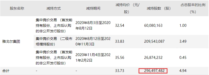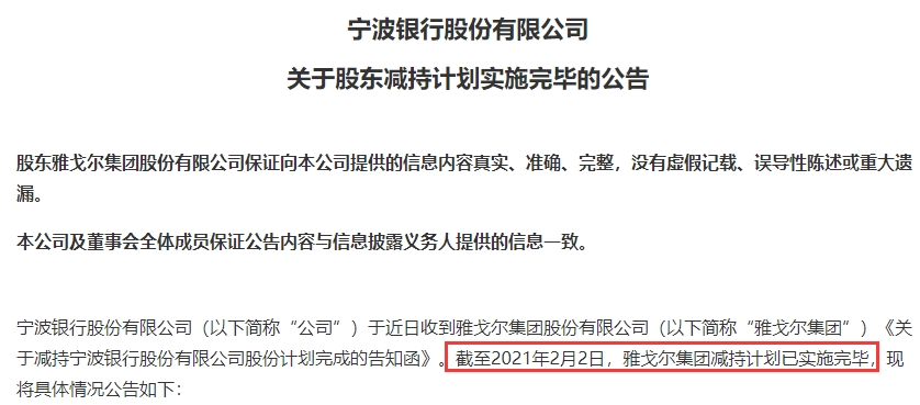 2月3日晚间,宁波银行发布公告称,截至2021年2月2日,雅戈尔集团减持计划已实施完毕,共计减持2.96亿股,占公司总股本的4.94%。