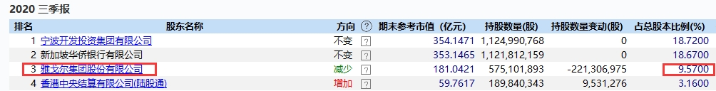 尽管减持了近5%的股份,但是雅戈尔集团仍持有宁波银行8.32%的股份,并仍然是第三大股东。