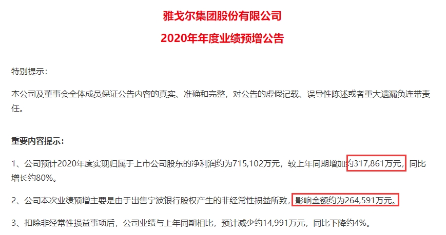 1月30日,雅戈尔发布业绩预增公告。雅戈尔表示,公司归属上市公司股东的净利润较上年同期增长80%,约32亿元左右,其中出售宁波银行股权获利26.5亿元,占总利润的83%。
