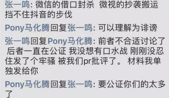 之后字节跳动的CEO张一鸣发布了一条朋友圈,主要内容是庆祝抖音在第一季度的苹果商店下载榜中排名全球第一。之后又说了一句“微信的借口封杀,微视的抄袭搬运挡不住抖音的步伐”。结果马化腾丝毫没给张一鸣面子,直接在这条朋友圈底下说张一鸣这话“可以理解为诽谤”。
