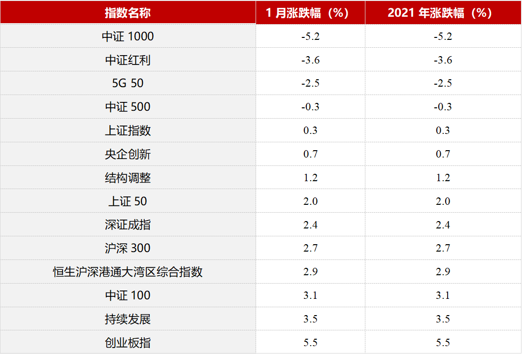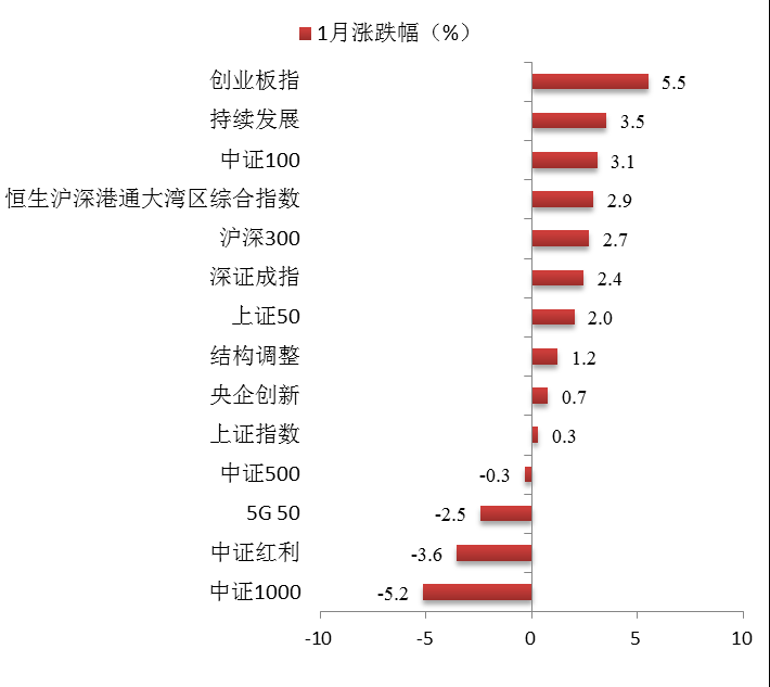 创业板指数2021年1月份收涨5.5%,继续领先其他主要股票指数。中证500、中证1000等宽基指数表现相对较弱。