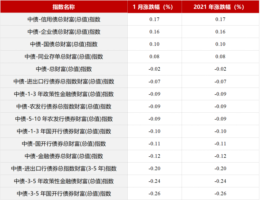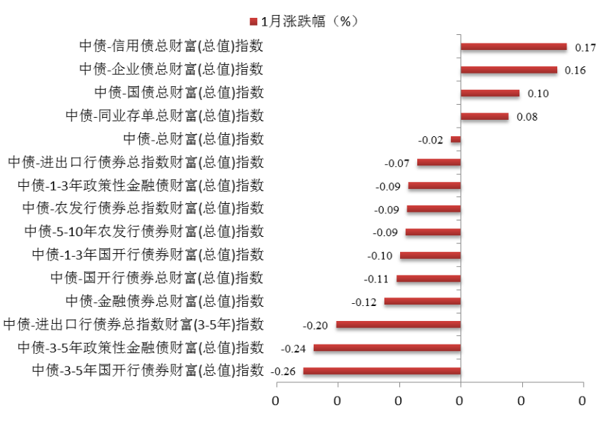 以下主要债券指数中,1月份涨幅最大的是中债-信用债总财富(总值)指数,涨幅为0.17%。中债-1-3年国开行债券指数等政策金融债指数略有收低。