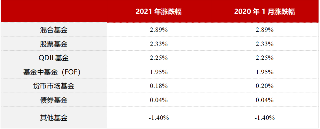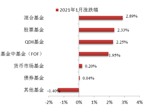 1月份混合型基金平均涨幅2.89%,股票型基金2.33%,货币基金和债券基金的平均涨幅分别为0.2%和0.04%。