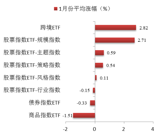 从不同类型ETF的收盘价的涨跌幅来看,1月份涨幅最大的是跨境ETF,约2.82%。