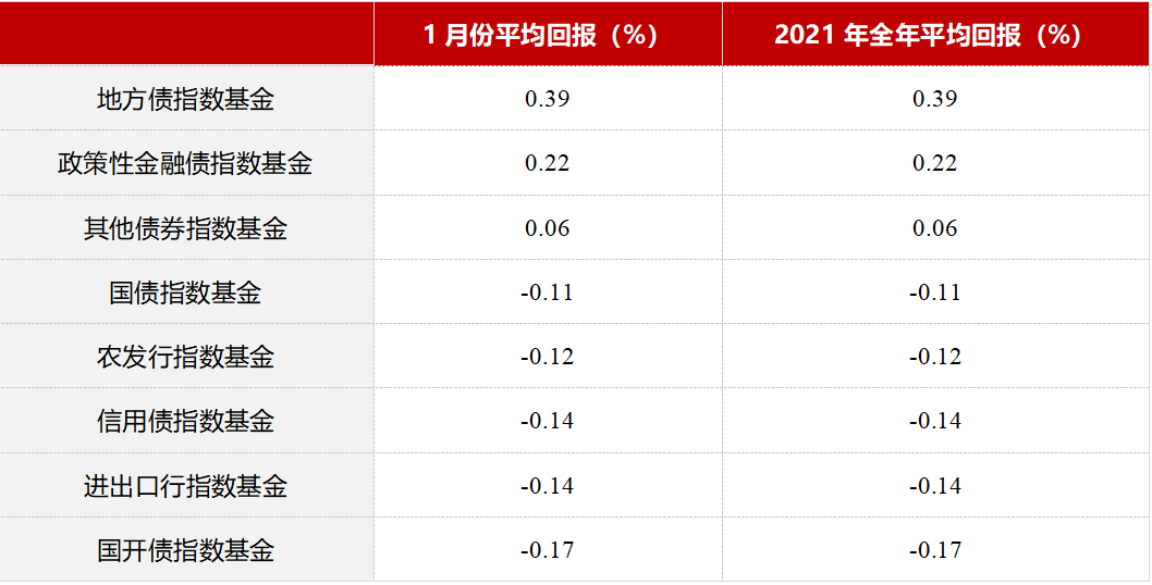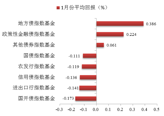 1月份进出口行指数基金、农发行指数基金、国开债指数基金的平均回报均出现小幅下跌。