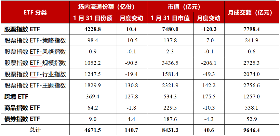 资金继续流入ETF市场。1月份非货币ETF的场内流通份额整体增加140亿份以上,资金流入股票主题指数ETF、跨境ETF的迹象明显,股票规模指数ETF有一定的资金流出。