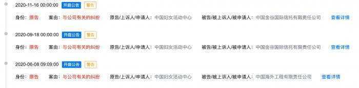 启信宝查询显示,二股东中国妇女活动中心于2020年9月18日和2020年11月16日分别作为原告有开庭记录,被告均为金谷信托,案由为与公司有关的纠纷。