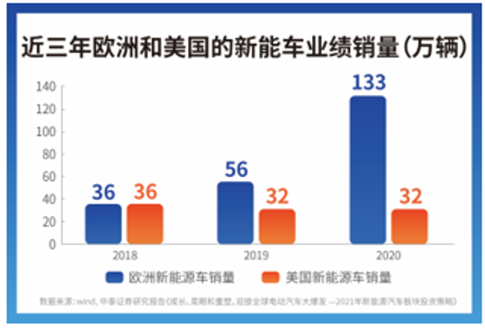 然后第二个,我们看新能源汽车这个行业一定要放眼全球,海外市场的话,欧洲市场作为整个汽车工业的老根据地,2020年是第一年开始出现新能源汽车的放量爆发式增长。去年欧洲主要有这么几个事情,第一就是欧洲的传统车企的压力越来越大,如果车企完不成碳排放的话,会遭受巨额罚款,或者要去购买碳的额度,所以像大众、宝马、奔驰这些传统的燃油车企,开始奋发崛起,开始加快猛追,加快新能源汽车的推出。然后第二个是特斯拉对于欧洲车企的冲击,其实大家可以看到,现在特斯拉在中国,尤其在上海应该都快成街车了,满大街都是。特斯拉对于欧洲车厂的冲击主要是在于特斯拉进入欧洲之后,没有多久就在它细分的市场持续爆发,这样对于欧洲的传统车企其实是带来很大的一个冲击。