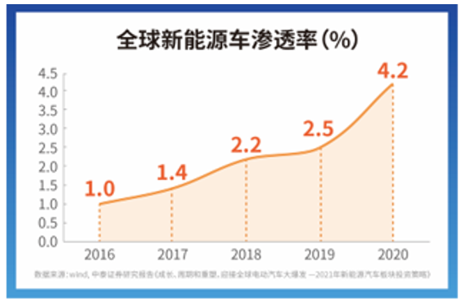 第一就是新能源汽车现在全球的渗透率是很低的,2010年的时候只有1%,1%里面大部分应该都是中国贡献的,到2020年之后是 4.2%。为什么从2.5%到4.2%,会有这么快的一个提升?是因为欧洲开始贡献了,主要是特斯拉,还有欧洲的很多车型都出来了。到2021年不出意外的话,肯定是5个点以上了。以前我看过一本书,就是说从消费品角度来看,比如说智能手机或者新兴技术出来的时候,渗透率到5%~10%之后,渗透率曲线会出现加速。
