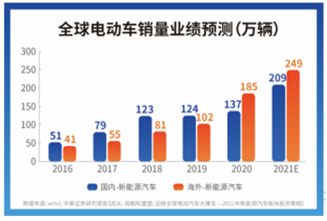 梁杏:我看苏总之前还做了一个预测,就是全球电动车销量业绩的预测,数据看上去也是非常的诱人。这个是到2021年,大家可以看一下这个数字又比2020年又是高了一大截,国内的话这个是209万,然后这个是137万,相当于是增加了70万左右,海外的话也是有一个非常明显的一个增幅,也是超过60万辆。确实,新能源汽车可以算是已经到来的一个未来,它确实是一个长期发展的方向,这一点也是我们非常认同的。